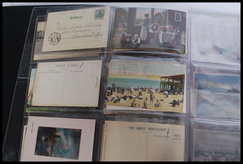 A collection of postcards within an album to include various early to mid century views; seaside, Witham, some foreign greetings cards, and others. Within a part filled postcard album. Approx 100 cards. Brown album