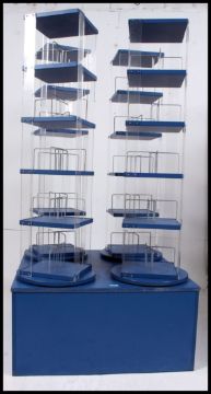 A retro 20th century blue library bookstand.In blue, with plinth base having 4 revolving stands. 167x87x87cm