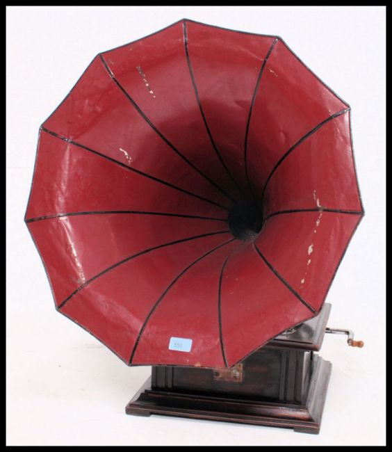 A vintage oak cased HMV His Masters Voice gramaphone, with painted a painted metal Morning Glory horn with oak cased record player with a label to the front for HMV The Gramophone company Ltd