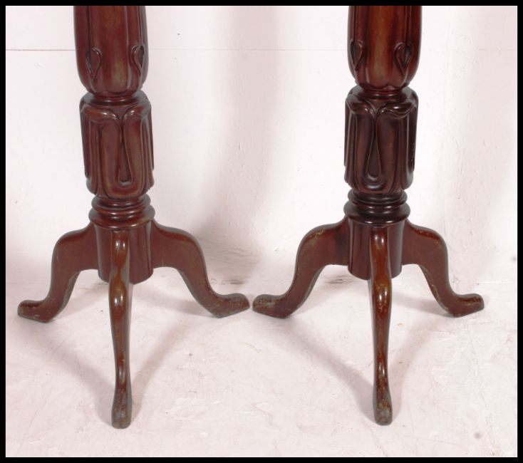 An excellent pair of Victorian large mahogany torchere - plant stands. Raised on cabriole legs with pad feet supporting stunning inverse tapered carved reeded columns with terraced bases atop. 136x24cm