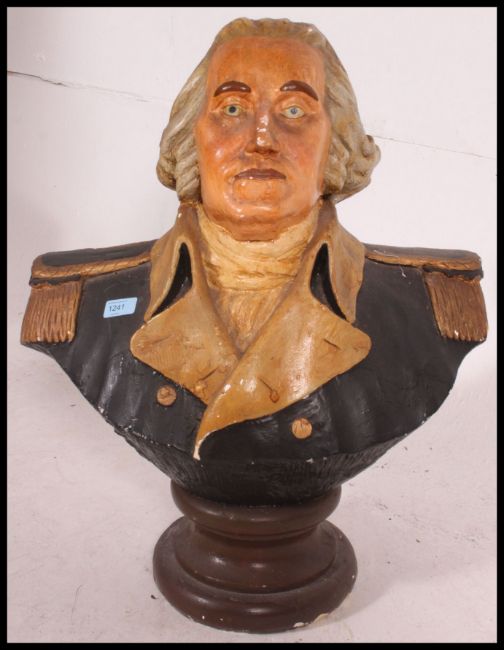 A large 20th century plaster bust of Lord Nelson. Depicting Nelson in a full bust, with hat removed. The raised features being hand painted. On a socle base. 70cm tall approx.