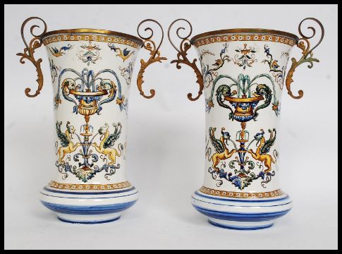 A pair of 19th century Gien Faience vases of waisted form again with gilt metal mounts and rococo scroll handles. Stamped to base.( H-33) 34cm