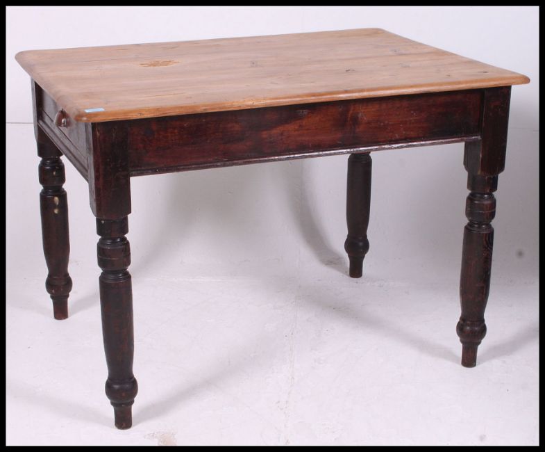 A Victorian 19th century country pine scrub top dining table raised on turned legs with fitted frieze and original drawer to one end. Above a flared edge plank top. H16 x W82cm