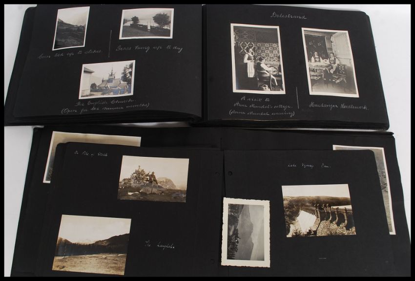 2 albums of black and white photograph albums one being entitled ' Scotland - A Holiday in the Highlands July 1934. Scenes from Various lochs etc. Also within same album ' A Holiday in Western Norway August 1936' again various scenes, ' A holiday in Killarney & South West Ireland 1938 including postcards. The second album containing black and white photographs from Wales, early 20th century circa 30's