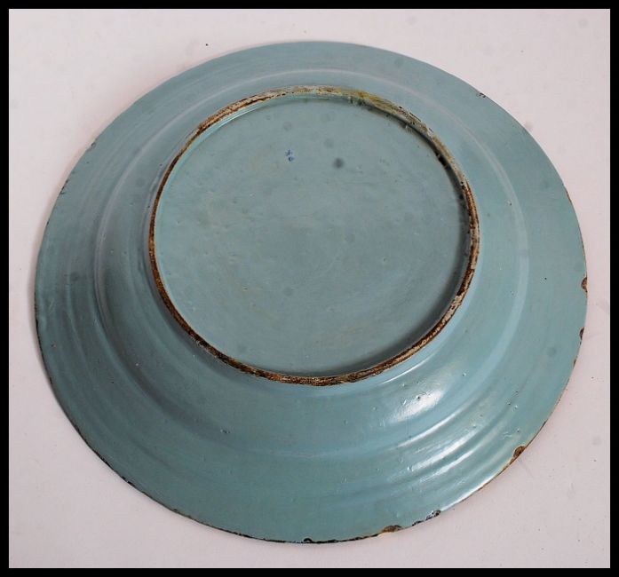 An 18th century blue and white Delft charger - large plate. Decorated with foliage to the bordes and country scene set to centre. W35cm