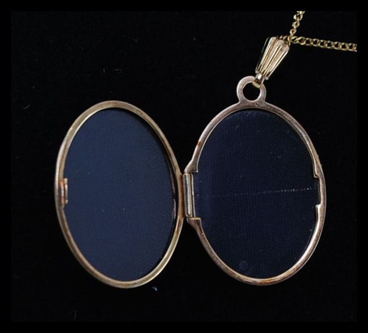 A 9ct gold ladies locket and 9ct gold necklace. The oval lozenge shaped locket with applied cornflower blue stone with cz stone surround. The locket marked 375, also the fine linked chain. Total weight 3.6g