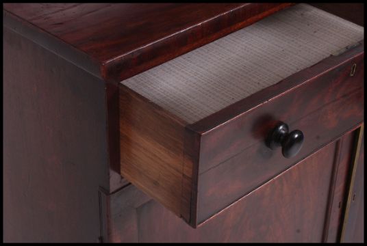 A 19th century Regency flame mahogany Chiffonier sideboard. Raised on turned legs with twin cupboard under twin short drawers. Above an angular stage gallery back with spiral twist supports. H135 x W109 x D40cm