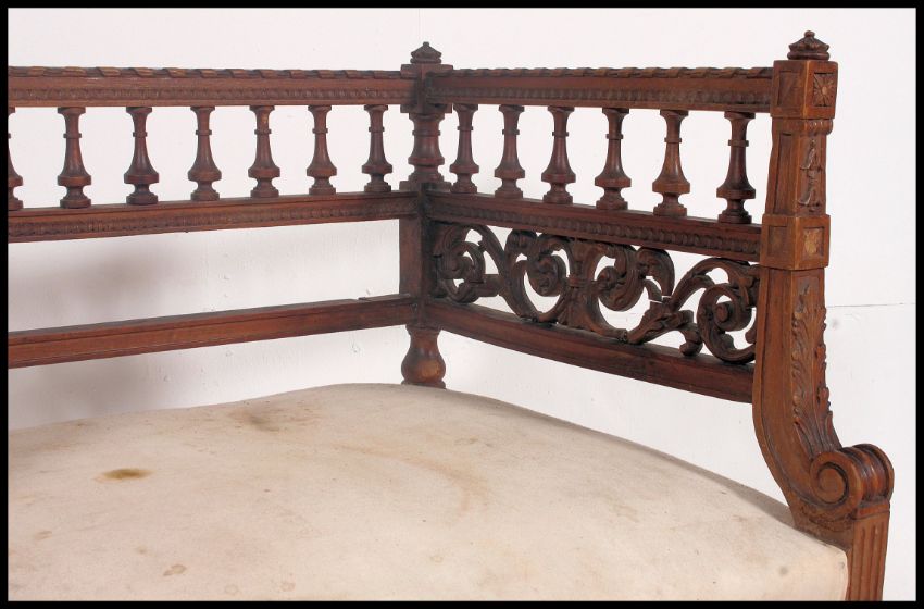 An early 20th century carved walnut Italian window seat. Raised on carved tapered legs with stunning spindle gallery surround having carved details. Upholstered in a white linen fabric. 70x70x52cm