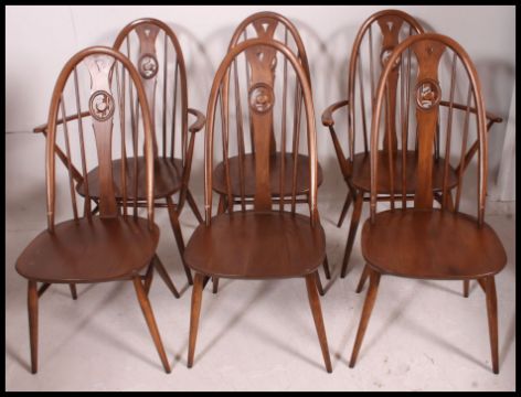 An excellent set of 6 Golden Dawn Ercol refectory dining chairs raised on turned supports united by strethcers. To include 4 standard chairs and 2 carvers. Matching large refectory table in lot 1166b