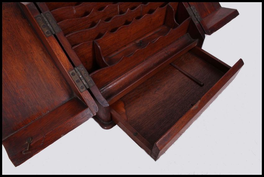A large Victorian walnut stationary / metamorphic desk tidy. The twin hinged doors with sectional fitted interior. H34 x W42 x D28cm
