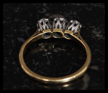An early 20th century 3 stone 18ct gold and platinum diamond ring marked for Bravingtons. The three round cut stones being claw mounted and illustion set in platinum. The diamonds approx 30pnts. Total weight 2.6g. Ring size N