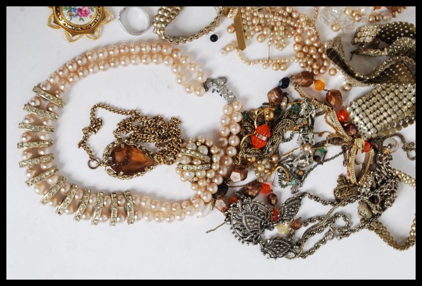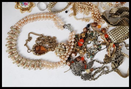 A collection of costume jewellery to include necklaces, tiepins, choker, mosaic bracelet, beads necklaces, yellow metal box necklace, pearl necklace and other pearls along with other items