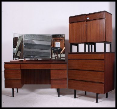 An excellent 1970's Meredew teak wood retro bedroom suite consisting of a pair of bedside cabinets, chest of drawers and a dressing table. The stunning furniture rasied on squared legs with blind front drawers.