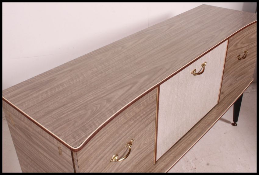 A 1950's Melamine low sideboard dresser raised on tapered legs with cupboards and drawers. Matching dining table in lot 1187. 79x153x45cm