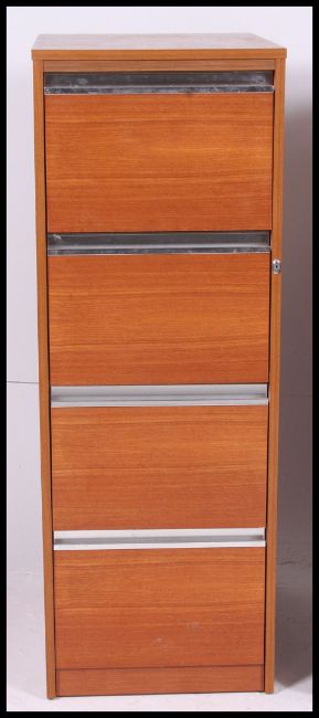 A near pair of retro 1960's / 1970's four drawer filing cabinets with a teak finish. Each upright cabinet with 4 deep drawers.