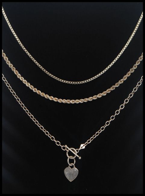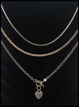 3 silver necklace chains, one with bar link and heart pendant. Together with a box linked chain and another. Total weight 29.7g