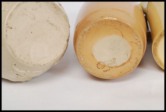 A collection of jugs to include a Players Please water jug, Wedgwood Bourn VIta jug, a Doulton glazed stoneware jug and a 19th century Harvest stoneware jug. H21cm