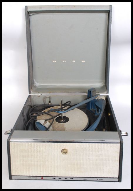 A vintage two tone portable Bush record player with hinged top and inset Monarch deck. Together with an audiotronic LA 1010 stereo amplifier