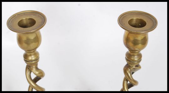 A pair of 17th century style twist brass candlesticks, each standing on a turned brass base. H34cm