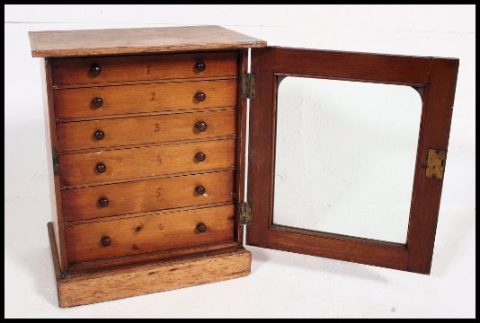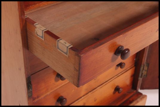 A Victorian pine Wellington type specimin cabinet. A bank of thin drawers within glass door, flared top above. 46x38x27cm