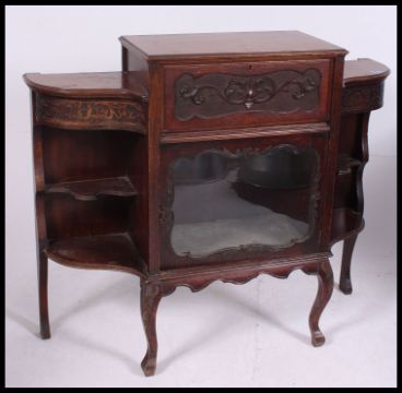 An Edwardian mahogany Chiffonier sideboard cabinet. Raised on shaped legs with glass cabinet to centre with shelves either side. 102x123x35cm