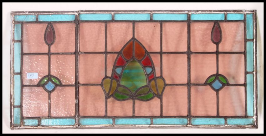 Two Edwardian leaded stained glass window panels, each with coloured glass. 42x87cm largest