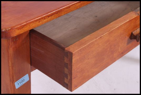 A mid century Air Ministry writing table desk with twin drawers to the frieze frame with squared legs to corners. 76x122x70cm