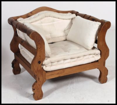 A fabulous 20th century retro Italian / Moorish window armchair having cream upholstery being constructed from pine raised on shaped legs and show wood frame with white upholstered fabric. 80x90x76cm
