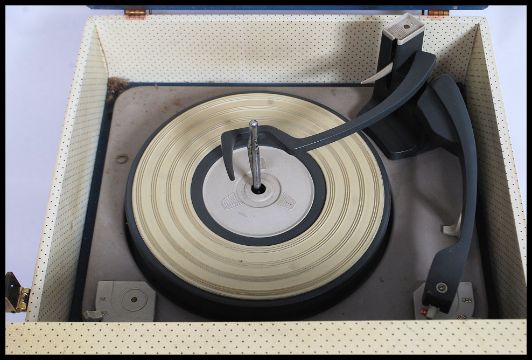 A vintage 1950's two tone Emerson Hi-Fidelity portable record player. The vinyl case blue and white with inset record deck