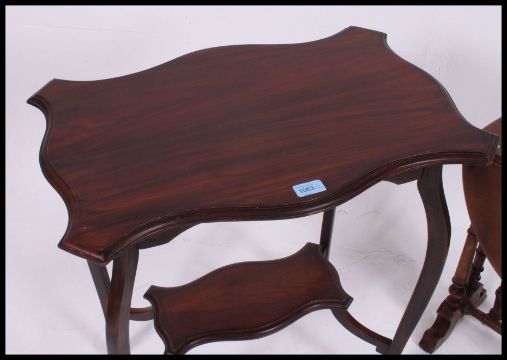 A late 19th early 20th century lamp table along with a similar aged Edwardian Sutherland table on turned legs with drop leaves. H69 x W61 x D41cm