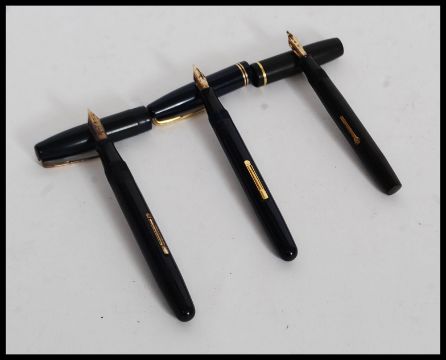 A vintage Watermans 14ct gold nib fountain pen in blue with gold trim together with a Conway Stewart 14ct gold nib fountain pen marked for the Scholastic Trading Co Bristol. Also a 14ct nib Watermans lever fill fountain pen