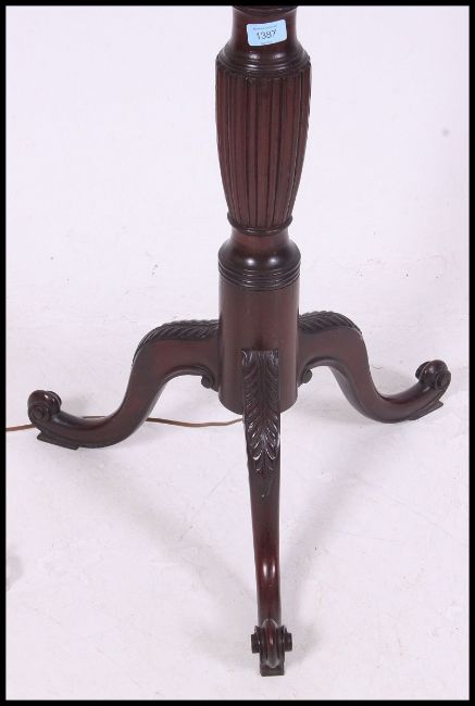 An early 20th century mahogany standard lamp with carved top above reeded column, above reeded lobed section to spreading tripod foot, with floral tassled shade.