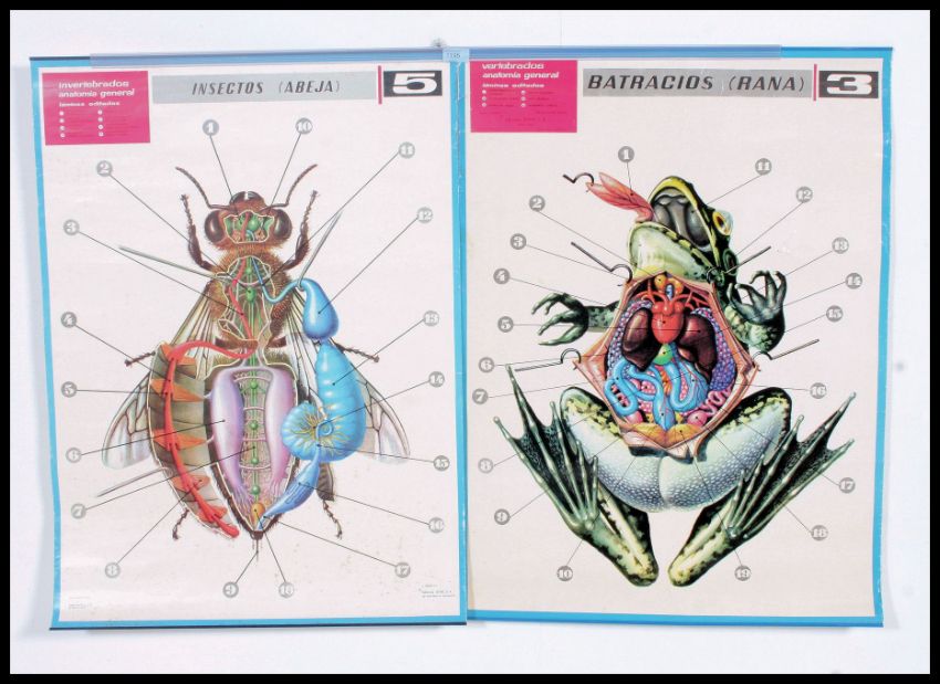A vintage / retro 1970's Spanish school pull down / roll up poster of the anatomy of a frog ( Rana ) along with another 1970's Spanish school poster of a fly ( Abeja ). H86 X W62cm