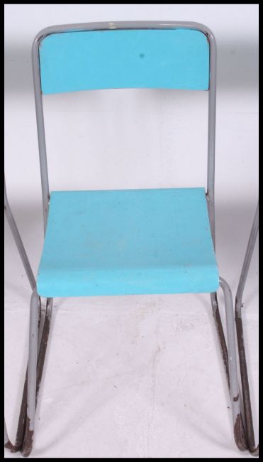 3 20th century Industrial type stacking chairs - workmens club chairs. Tubular frames with painted panel seats. H77 x W39 x D50cm