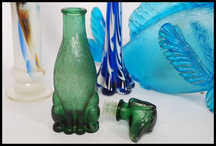 A collection of studio glass to include a fish, vases and a dog shaped glass decanter. L46cm