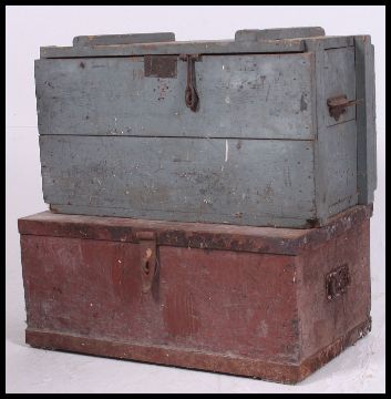 Two vintage early 20th century ? Pine tool boxes / ammo boxes, each being later painted with hinged lids. 38x66x38cm