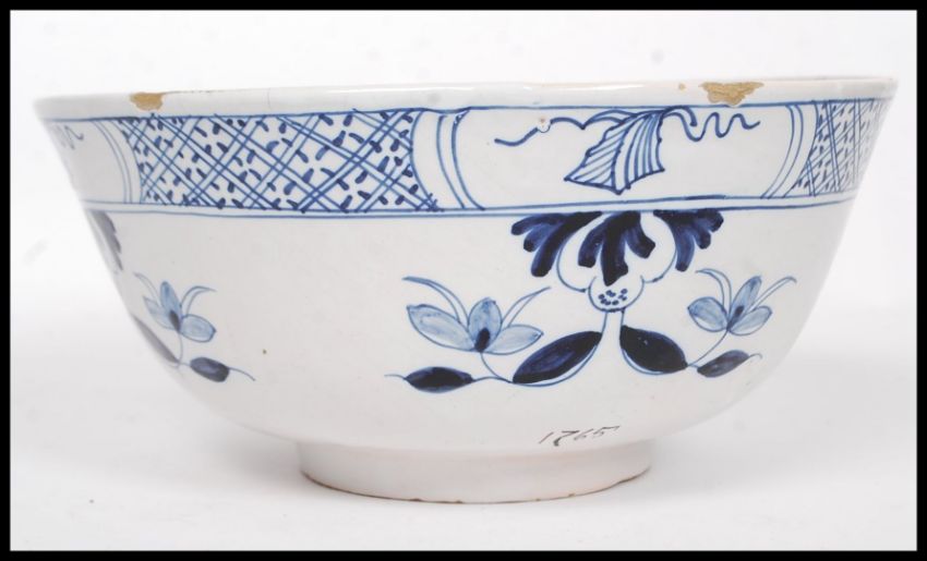 An 18th century blue and white Delft bowl with flower head decoration and geometric border 1765 written to the outer of the bowl. H28cm