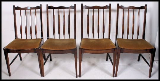 A set of 20th century Stag mahogany dining chairs raised on squared supports with drop in upholstered seats and railed back rests