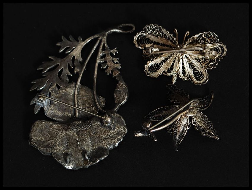 A silver filigree continental ladies brooch in the form of a butterfly together with a filigree flower brooch. Also with a white metal Art Nouveau flower brooch of large form being marked to the rear MASJ. Total weight 35g