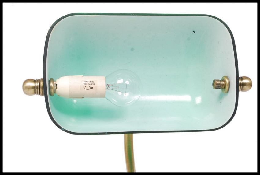 A 20th century contemporary antique style brass effect bankers desk top lamp with angular green glass shade