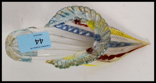 A fabulous mid century vintage miniature Murano ? studio art glass, glass slipper. Length 19cm in length. L20cm . Of coloured form with crimped edges