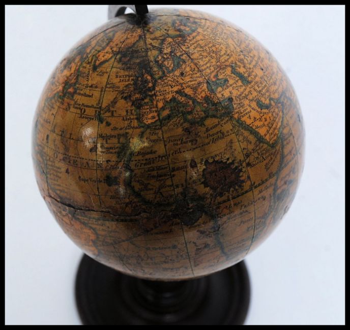 A fabulous and rare 19th century Georgian ' Smiths ' Terrestrial desktop Globe c1834. The miniature globe on a turned wooden base, with brass axis arm stretching to the top. Original laid paper to globe, with makers name ' Smiths 1834.' 17cm