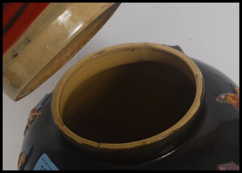 A large lidded StaffordshireChinese style pot, embellished with floral scenes and butterflies on black ground, please see images. H38cm