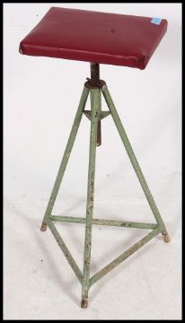 A mid century 20th century Industrial two tone machinists stool. The hairpin base painted green with square red vinyl padded seat.