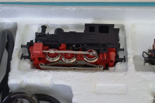 MARKLIN; A Marklin 2946 railway HO gauge trainset - appears to be complete within the original box, with locomotive, wagons, track and transformer.