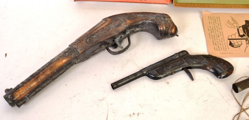 CAP GUNS; A collection of assorted vintage cap guns / cork guns and similar items to include an unused Luger Automatic Jnr pellet gun (appears unused, with pellets still attached to inner sleeve), Black Phantom and three other loose guns.