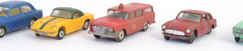 CORGI & DINKY: A collection of 8x vintage loose Corgi & Dinky diecast model cars, comprising of; Plymouth, Imp, Lotus, Fire Chiefs Car, MGB, Mustang, Rover, and a ' Vote Corgi! ' Land Rover.