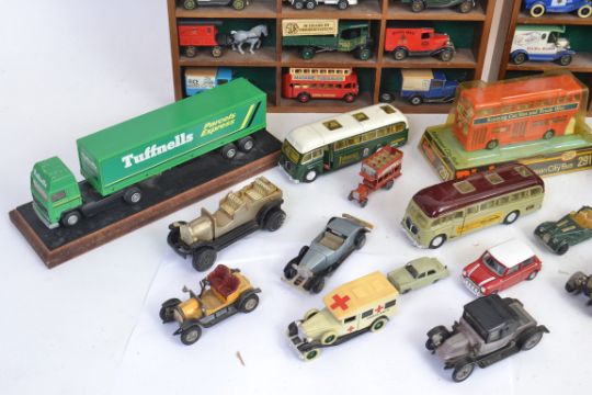 DIECAST: A collection of assorted loose diecast - mostly Matchbox Models Of Yesteryear, 2x display cabinets, a boxed Dinky 291 bus and other items.