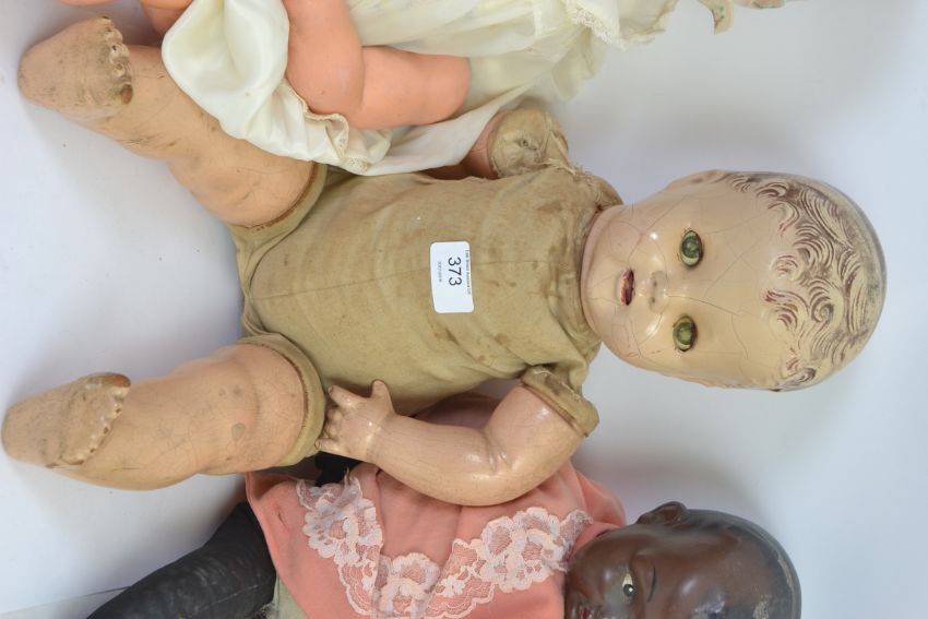 DOLLS: A collection of 3x dolls to include an German made doll stamped ' HW Germany 350 ' to head (needs re-stringing, limbs loose) along with a composition headed black doll and a plastic molded baby doll with opening eyes.