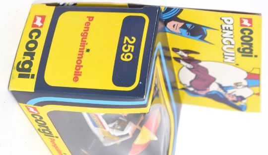 CORGI BATMAN PENGUINMOBILE: An original vintage Corgi diecast model 259 Batman Penguin Penguinmobile. Absolutely mint, appears totally untouched / unopened. Ex- shop stock. Rear flap remains unfolded. Superb.